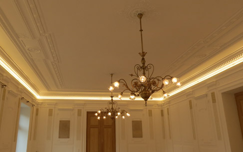 LEISTUNGSUMFANG Folgende Leistungen wurden geplant und umgesetzt: Vor der Umbauphase wurde dieser Raum nur durch zwei Barockluster beleuchtet. Das Lichtniveau war deshalb nicht mehr zeitgemäß. Eine Lösung musste gefunden werden, die sowohl die architektonischen als auch die beleuchtungstechnischen Bedürfnisse befriedigt. Die Luster sollten zudem bestehen bleiben und sich harmonisch in das Gesamtbild einfügen. Die Entscheidung fiel auf eine umlaufende LED-Beleuchtung in einer Aluschiene, die weiß pulverbeschichtet wurde. Im ausgeschalteten Zustand kann die Schiene aufgrund ihrer Farbe und ihrer Position, da sie sich direkt über einem Stuckelement befindet, nicht wahrgenommen werden. Die umlaufende Beleuchtung musste aufgrund der Größe des Raumes in sechs Abschnitte unterteilt werden, die jeweils eine separate Versorgung erforderten. Um die Leitungslängen für die Versorgungsleitungen der LED-Bänder gering zu halten, wurden in zwei Fensternischen Unterputzverteiler montiert. In jedem Verteiler wurde ein Trafo installiert. Zur Ableitung der Wärme wurden Luftlöcher in die Verteilertüre gebohrt. Trotz der nahen Verteiler variierten die Längen der Versorgungsleitungen für die sechs Abschnitte zwischen 5m und 16m. Um dem Spannungsabfall bei 24V entgegenzuwirken, wurden verschiedene Querschnitte von 1,5mm² bis 6mm² installiert.